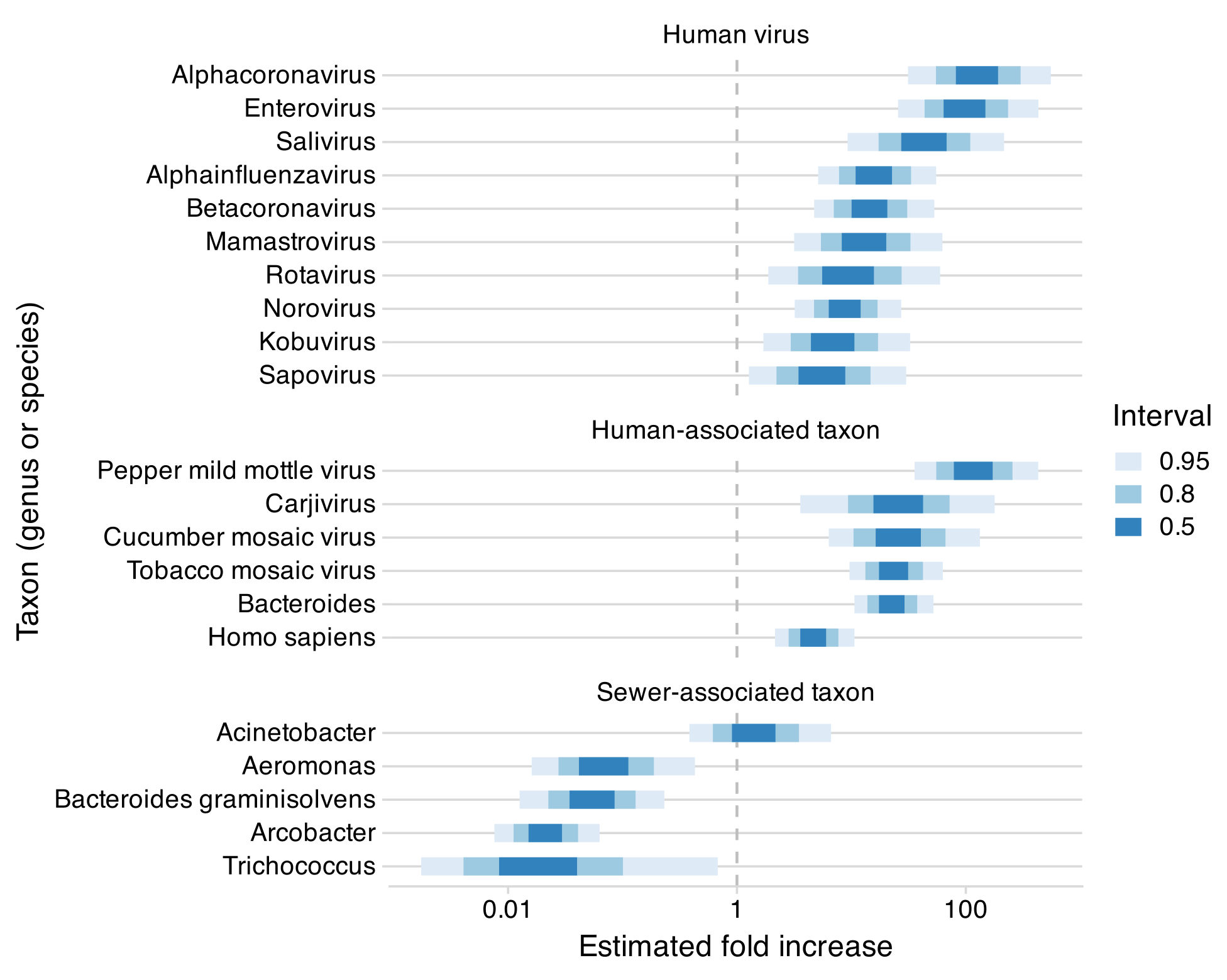 Figure 1: The estimated fold increase in the relative abundance of various biological taxa (groups of organisms such as a genus or species) in airplane versus municipal wastewater (Figure 4 from the preprint). Human viruses (top) and other human-associated taxa (middle) show increases much greater than one, while most sewer-associated bacteria (bottom) show decreases. Bars show 50%, 80%, and 95% credible intervals from a Bayesian negative binomial regression model.