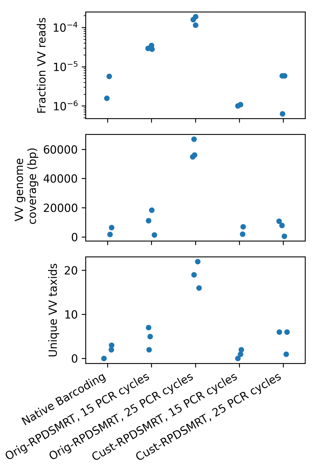 Overall, we find that the “Orig-RPDSMRT” protocol outperformed others on key metrics, and that 25 PCR cycles outperformed 15 PCR cycles. We are most interested in studying vertebrate-infecting viruses: Orig-RPDSMRT has the highest proportion of these taxonomies of interest, allowing us to monitor them more cost-effectively. It also has overall higher-quality data, with longer reads and lower duplication rates compared to the other protocols.