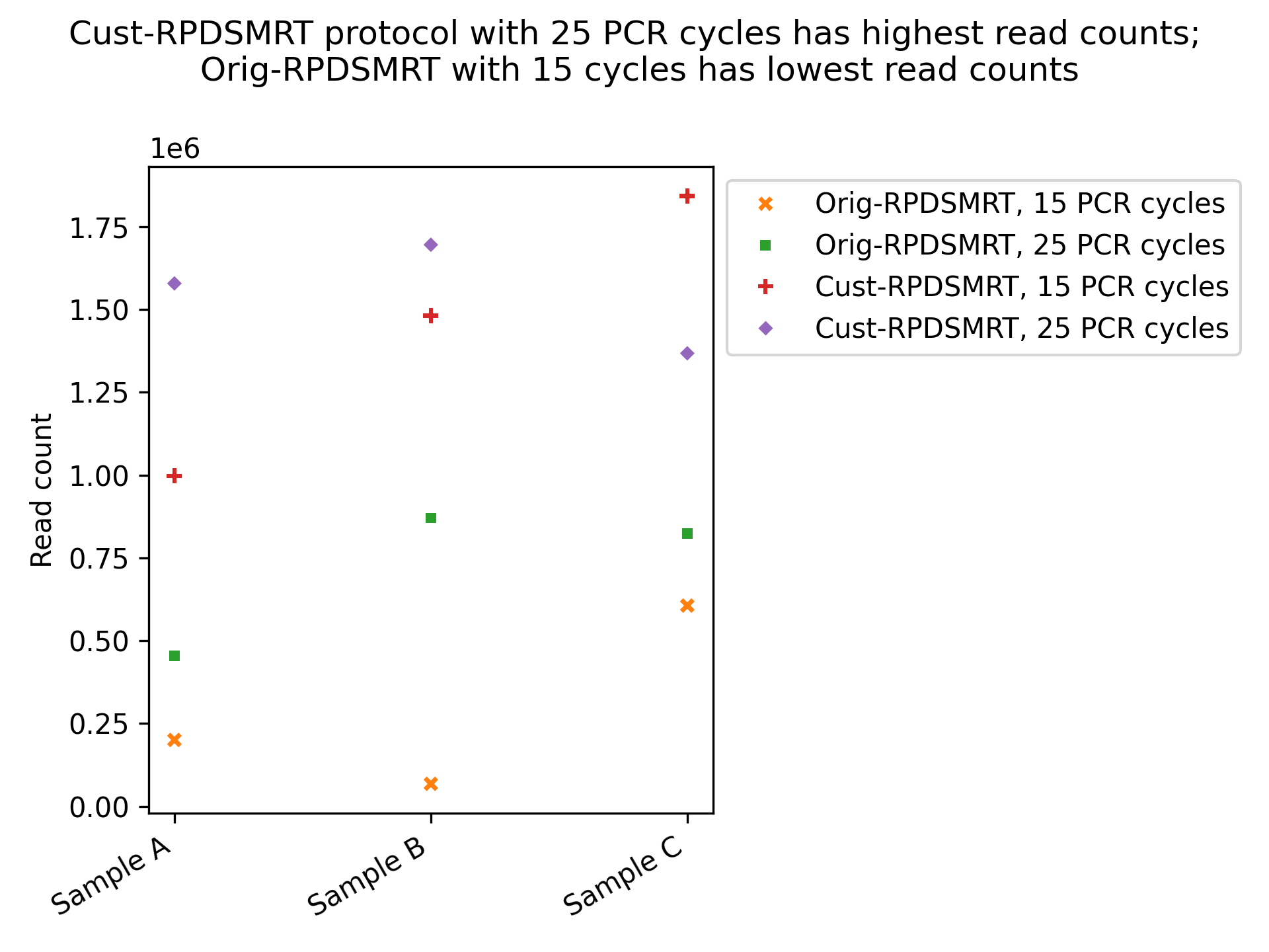 We next checked read counts (Figure 5) and read lengths (Figure 6) for each protocol. We focused on comparing read counts within the two different variations of the Rapid SMART protocol.1 We see that Orig-RPDSMRT has the lowest read counts but the longest reads, while Cust-RPDSMRT has the opposite (high read counts but short read lengths).2 As we would expect, more PCR cycles boosts read count.
