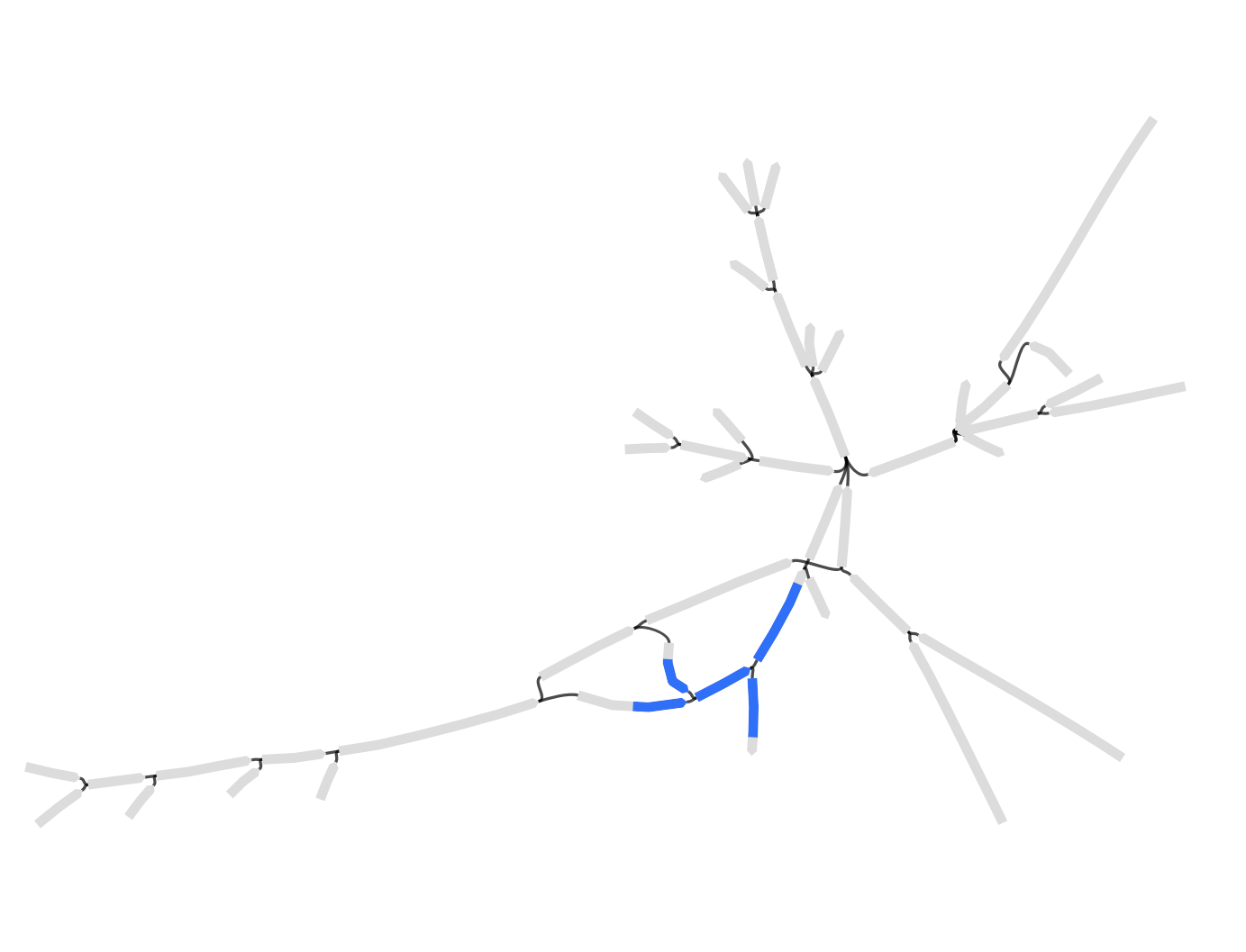 In standard assembly, ambiguities lead to branches in assembly graphs and thus to shorter contigs. For example, if reads attest to genomes AB and AC (where A, B, and C are sequences of some length), assemblers will return separate contigs A, B, and C, since it’s ambiguous whether A is followed by B or C. But if our seed is contained in contig A, we should also retain contigs B and C, even if they don’t directly contain the seed: both are possible extensions of the seed-containing contig and may carry valuable information. The outward assembly pipeline supports identifying relevant contigs via a two-step process. First, outward assembly computes all overlaps between contigs — where the end of one contig matches the beginning of another. Then outward assembly retains all contigs that either contain the seed or overlap with a contig containing the seed.3