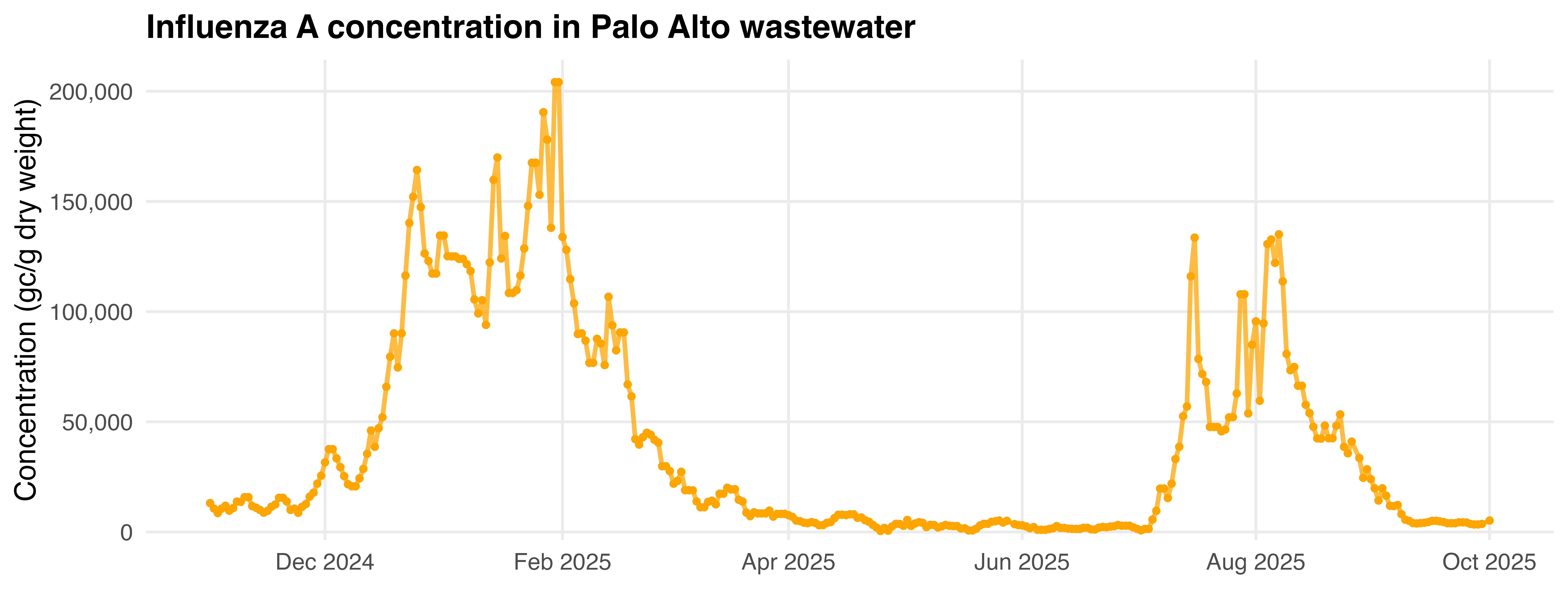 Figure 4: Concentrations, in gene copies per gram of dry weight, of influenza A in Palo Alto wastewater from WastewaterSCAN. The left side of the graph shows the typical winter influenza season, between November 2024 and March 2025 and with thousands of associated clinical cases. The right side of the graph shows the atypical summer influenza spike which had no associated clinical cases.