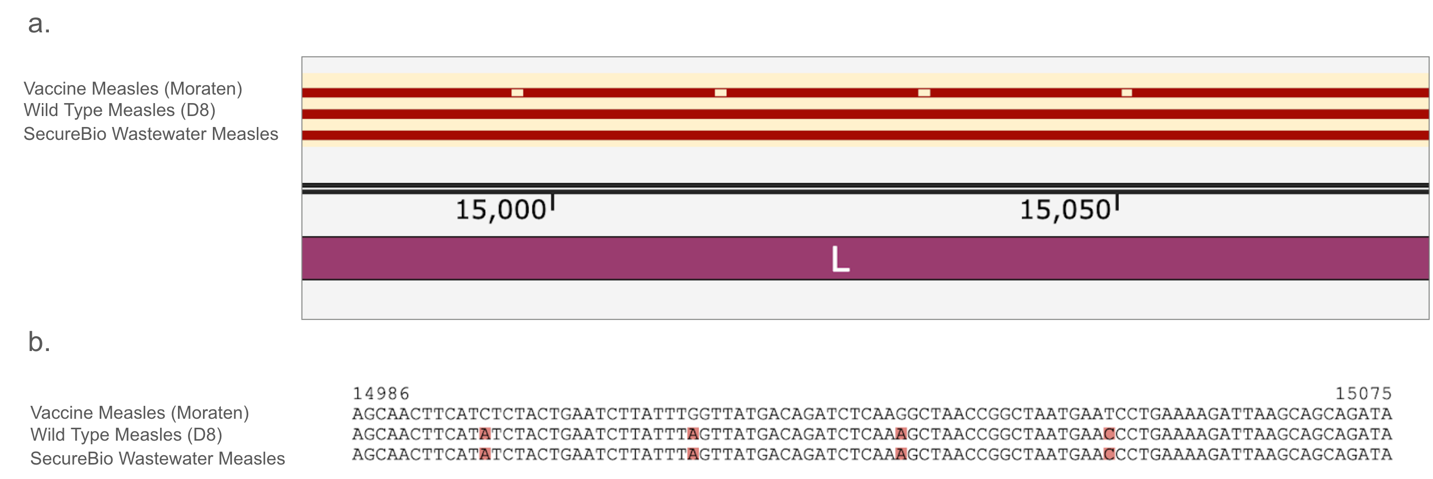 Figure 3: Genomic confirmation of wild-type measles in wastewater. Part a shows the vaccine strain compared to wild type and SecureBio’s wastewater detection along the measles genome. Mismatches between the vaccine and the latter two are shown as blank boxes. Part b shows more details of the alignment, showing that not only did the wastewater not match the vaccine, it perfectly matched the circulating wild type, with the same mutations in the same locations. Mismatches are highlighted in red.