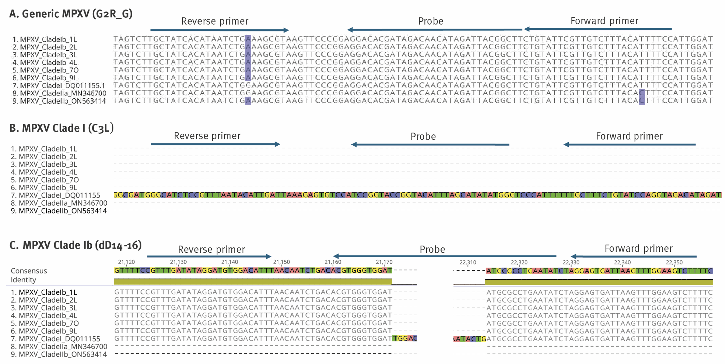 Figure 2: Sequences of the mpox virus, showing how the virus had mutated. Panel B shows the previous Clade I genome, and where the primers and probes would bind. Panel C shows the new Clade Ib, highlighting the missing section where the previous probe would no longer bind.